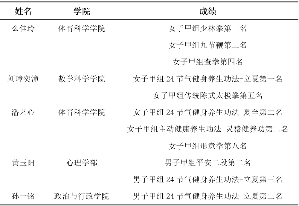 本屆賽事共有241所院校1200余名運動員參賽,創(chuàng)參賽人數(shù)歷史新高。天津師范大學(xué)武術(shù)隊經(jīng)過層層篩選,選派么佳玲(體育科學(xué)學(xué)院)、郭良佼(體育科學(xué)學(xué)院)、潘藝心(體育科學(xué)學(xué)院)、楊耀翔(體育科學(xué)學(xué)院)、劉璋奕潼(數(shù)學(xué)科學(xué)學(xué)院)、孫一銘(政治與行政學(xué)院)、黃玉陽(心理學(xué)部)、楊利偉(化學(xué)學(xué)院)8名運動員參加少林拳、查拳、形意拳、九節(jié)鞭、劍術(shù)、健身功法、集體器械等諸多項目的競賽,經(jīng)過激烈角逐,我校武術(shù)隊共收獲2金5銀1銅、1個第四名、1個第五名、1個第八名的優(yōu)異成績。