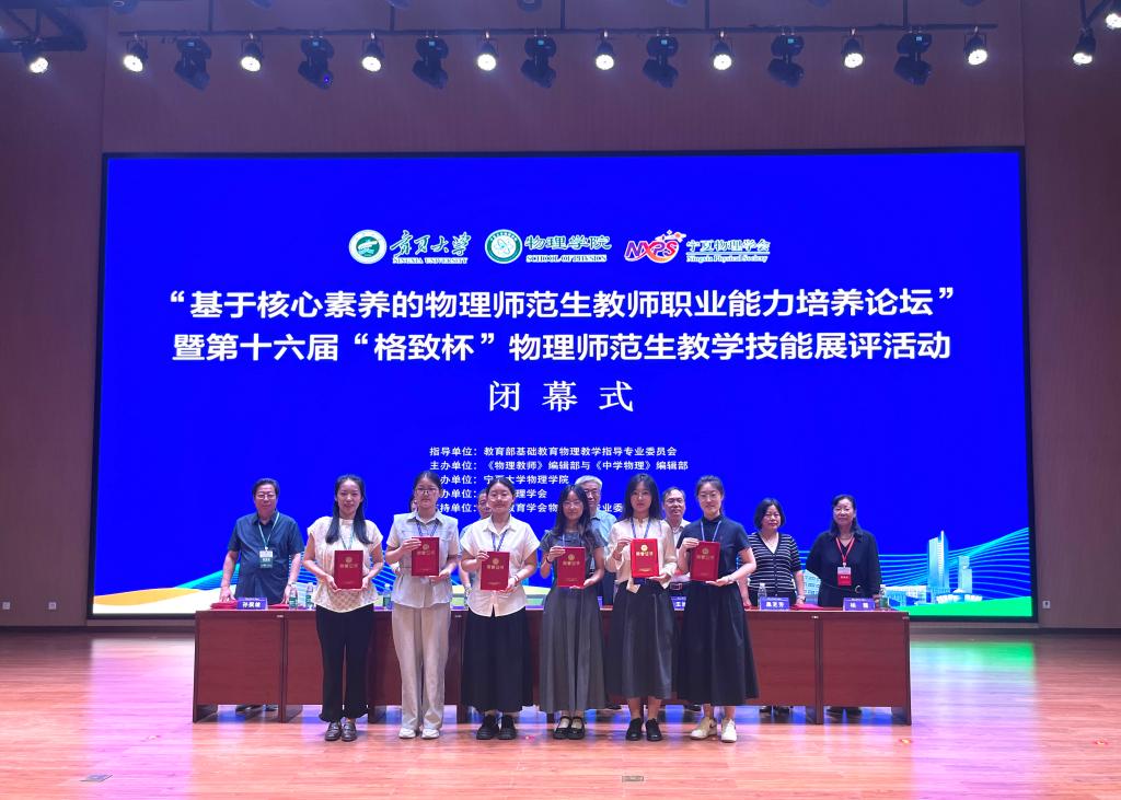 本站訊(通訊員郝健強 楊雪)7月25日至27日,基于核心素養的物理師范生教師職業能力培養論壇暨第十六屆“格致杯”全國物理師范生教學技能展示與交流活動在寧夏大學舉行。本次活動吸引全國百余所高校參與,我校物理與材料科學學院師生表現突出,共斬獲包括“優秀組織獎”在內的11項榮譽,其中溫熙雅包攬教學技能展示、創新實驗設計與自制教具雙項一等獎,陳楷月、侯家瑞、于佳靈、張欣4位同學在兩項賽事中均獲二等獎。