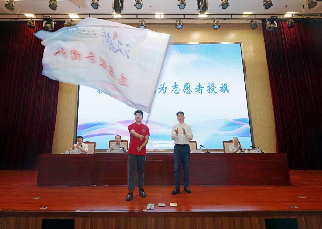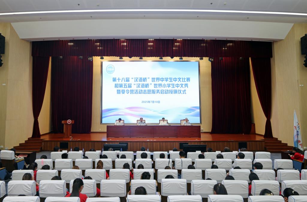 本站訊(通訊員 趙英東)7月10日上午,第十八屆“漢語橋”世界中學生中文比賽和第五屆“漢語橋”世界小學生中文秀暨夏令營活動志愿服務啟動授旗儀式在會議中心大報告廳舉行。校黨委書記曲凱,黨委副書記、校長鞏金龍,世界漢語教學學會會長、我校部校共建國際中文教育發展研究院院長鐘英華,校黨委常委、副校長白學軍出席授旗儀式。儀式由鐘英華主持。學生處、校團委、教育學部、外國語學院、文學院、歷史文化學院、新聞傳播學院、部校共建國際中文教育發展研究院、國際教育交流學院等相關單位負責同志,近200名教師志愿者和學生志愿者參加活動。
