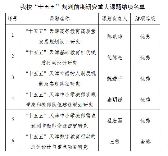 本站訊(通訊員 劉鑠華)近日,天津市教育科學規劃領導小組辦公室公示了天津市教育事業發展“十五五”規劃前期研究重大課題結項名單,我校取得優異成績,共有6項課題成功結項,充分展示了我校在教育科學研究領域的實力和水平。