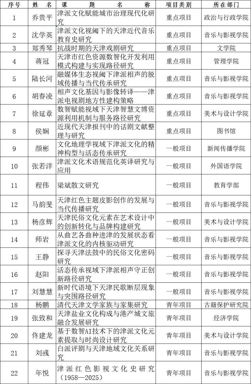 本站訊(通訊員 宋昊澤)近日,2025年天津市哲學社會科學規劃項目津派文化研究專項發布,我校共立項22項,其中重點課題8項,一般課題9項,青年課題5項。立項總數位居天津市第一。
