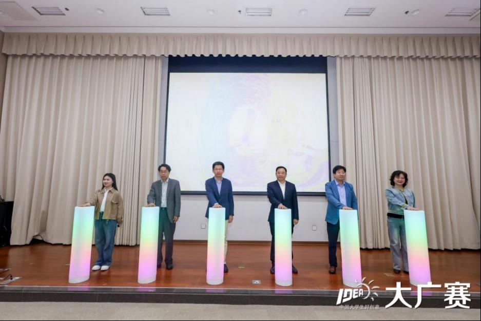 在啟動(dòng)儀式環(huán)節(jié),天津市教育委員會(huì)高教處副處長(zhǎng)許晶,天津師范大學(xué)副校長(zhǎng)紀(jì)德奎、教務(wù)處處長(zhǎng)豐向日、新聞傳播學(xué)院黨委書(shū)記張家玥,大廣賽天津賽區(qū)評(píng)委會(huì)主任范志國(guó),北京眾行互動(dòng)數(shù)字文化傳媒有限公司校招總監(jiān)安靜共同點(diǎn)亮象征賽事啟航的啟動(dòng)裝置,與臺(tái)下觀眾一起見(jiàn)證第17屆大廣賽天津賽區(qū)競(jìng)賽啟動(dòng)的重要時(shí)刻。