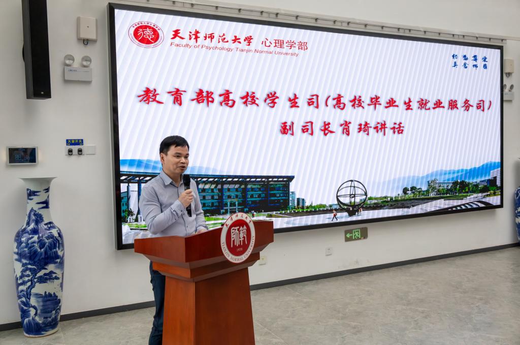 本站訊(通訊員 于海濤)5月8日下午,心理學(xué)部心青年志愿服務(wù)團(tuán)授旗儀式暨天津師范大學(xué)沈德立科學(xué)家精神宣講團(tuán)成立儀式在京津冀心理服務(wù)與社會治理中心一樓舉行。教育部高校學(xué)生司(高校畢業(yè)生就業(yè)服務(wù)司)副司長(掛職)肖琦、我校黨委副書記陳玳瑋出席。黨委教師工作部、黨委學(xué)生工作部、校友服務(wù)與管理中心、心理學(xué)部相關(guān)負(fù)責(zé)同志及師生校友代表參加活動。儀式由學(xué)部黨委副書記、紀(jì)委書記米溢主持。