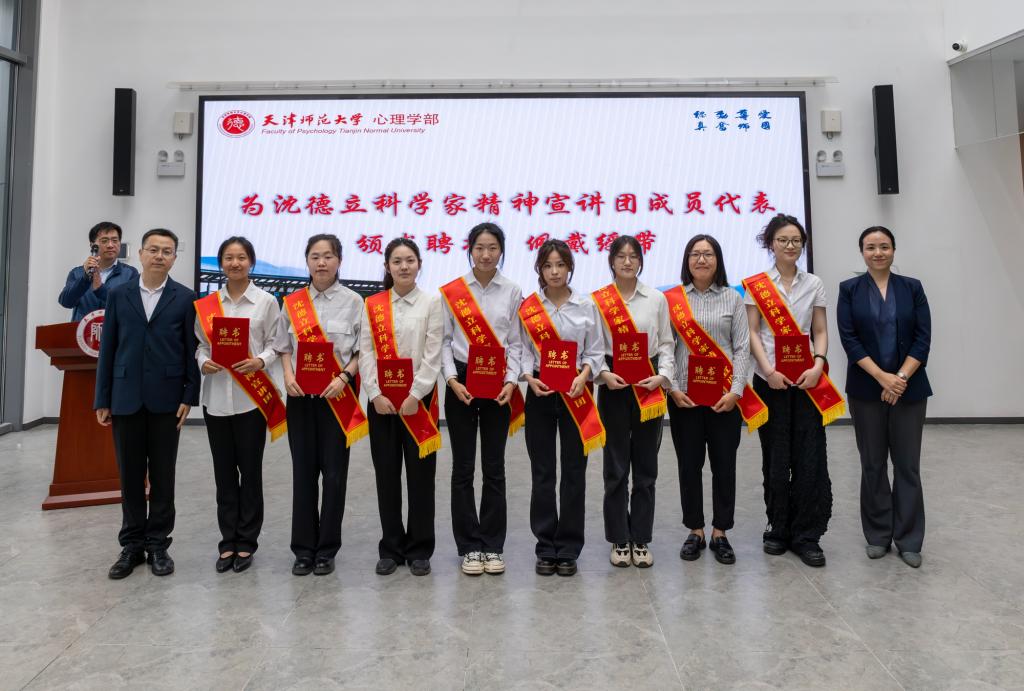 與會領(lǐng)導(dǎo)為沈德立科學(xué)家精神宣講團(tuán)成員代表頒發(fā)聘書、佩戴綬帶。學(xué)部校友、南開中學(xué)穆玉鳳、天津一中王亞麗、耀華中學(xué)張紅肖、新華中學(xué)許岳寧、實(shí)驗(yàn)中學(xué)郭雯、天津師范大學(xué)附屬實(shí)驗(yàn)學(xué)校孫銘悅受聘為校外宣講員,校友服務(wù)與管理中心主任楊琥、天津市學(xué)生心理健康教育發(fā)展中心副主任李馨、全國高校“雙帶頭人”教師黨支部書記“強(qiáng)國行”專項(xiàng)行動團(tuán)隊(duì)成員林琳受聘為宣講團(tuán)校內(nèi)指導(dǎo)教師。