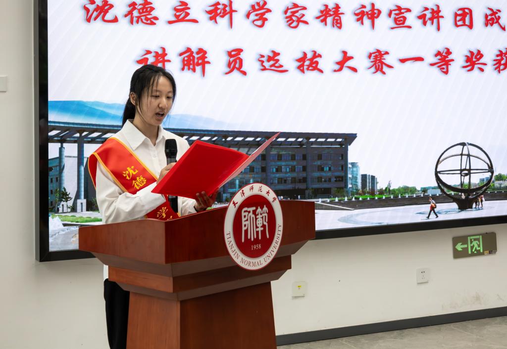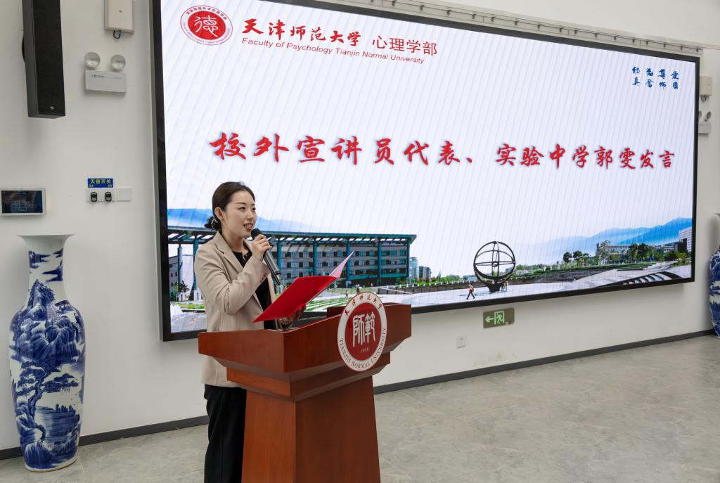 儀式上,與會師生共同觀看了紀(jì)錄片《我們的大先生》,共同學(xué)習(xí)沈德立先生“愛國、尊師、勤奮、認(rèn)真”的治學(xué)精神和“人以德立”的崇高品質(zhì)。心青年志愿服務(wù)團(tuán)團(tuán)長姜穎作服務(wù)團(tuán)情況介紹,并帶領(lǐng)服務(wù)團(tuán)全體成員莊嚴(yán)宣誓。沈德立科學(xué)家精神宣講團(tuán)成員、學(xué)部“心青年開講啦”講解員選拔大賽一等獎獲得者趙莞歆、校內(nèi)指導(dǎo)教師代表、天津市學(xué)生心理健康教育發(fā)展中心副主任李馨、校外宣講員代表、天津?qū)嶒?yàn)中學(xué)心理健康教師郭雯先后發(fā)言,表達(dá)了傳承科學(xué)家精神,講好大先生故事的決心。