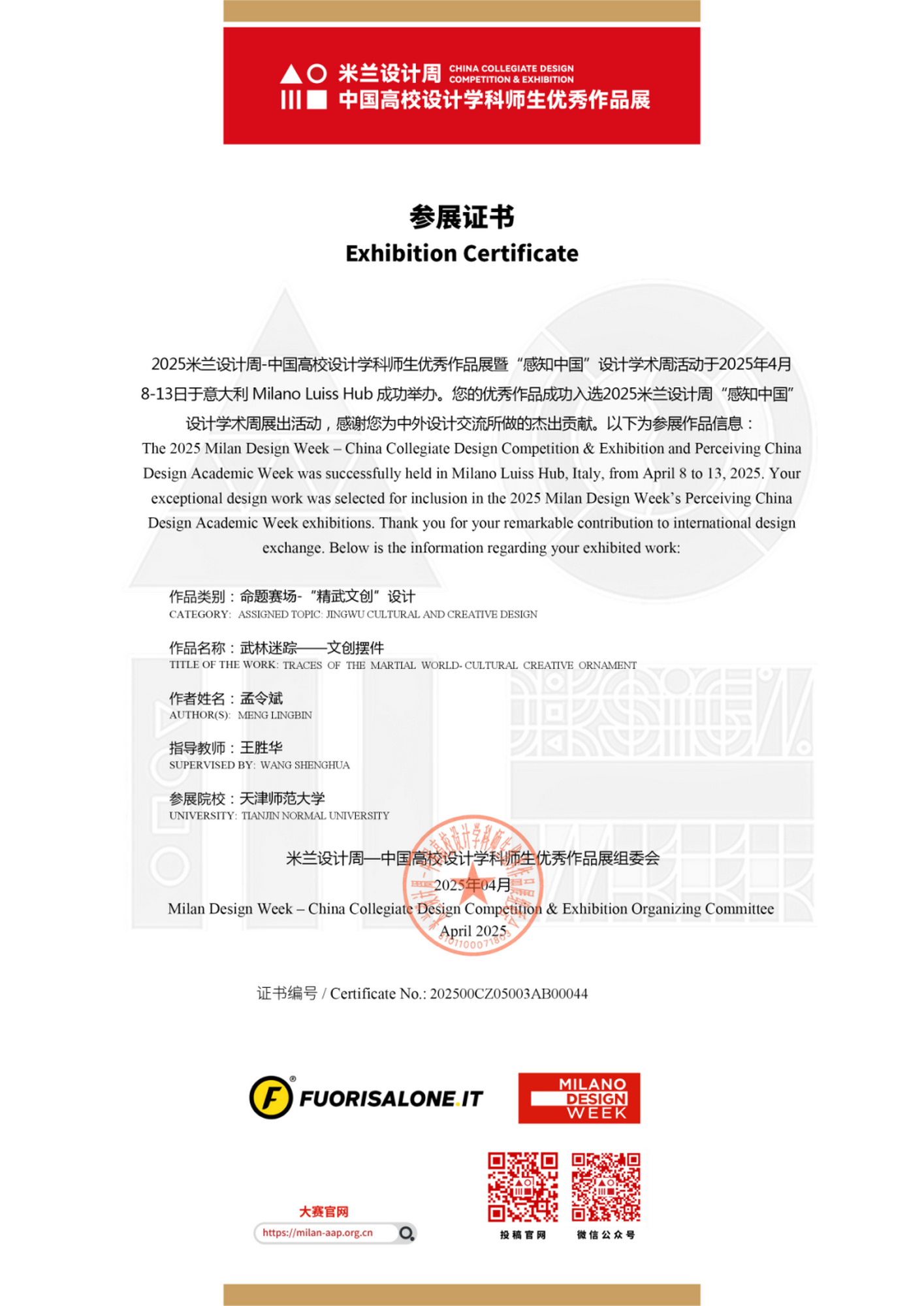 自2023年起,美術與設計學院聯合西青區精武鎮政府,打造了米蘭設計周-中國高校設計學科師生優秀作品展之“精武文創”命題賽道。《吟吾》與《武林迷蹤》均是“精武文創”國賽一等獎作品。從天津文化沃土的深耕細作到米蘭設計周的聚光燈,印證了將地域文化基因轉化為國際設計語言的可行性,實現了“在地性”與“全球性”的平衡,是學院深化“新藝科”建設、踐行“服務地方、文化賦能”育人理念的生動實踐。