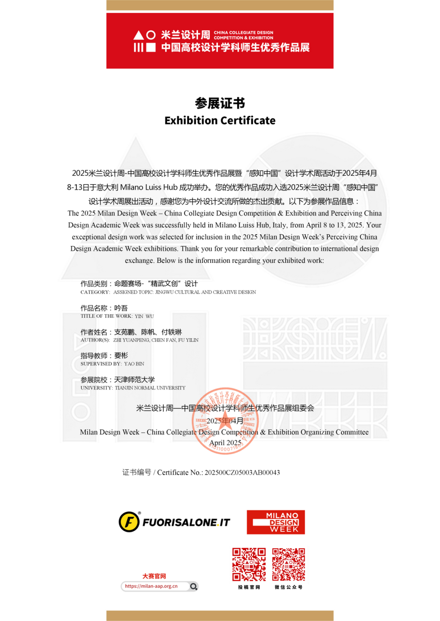 2025年4月8日至13日,由意大利米蘭設計周組委會、中國高校設計學科師生優秀作品展組委會等聯合主辦的“感知中國”設計學術周拉開帷幕。我校美術與設計學院研究生支苑鵬、陳帆、付軼琳的藝術作品《吟吾》(指導教師:要彬),本科生孟令斌的文創設計作品《武林迷蹤——文創擺件》(指導教師:王勝華)脫穎而出,亮相這一國際設計盛會,向世界傳遞中國設計的創新力量與文化底蘊。
