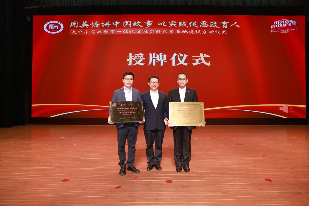 儀式現(xiàn)場(chǎng),張凡林代表中國(guó)國(guó)家創(chuàng)新與發(fā)展戰(zhàn)略研究會(huì)中國(guó)故事研究院為天津師范大學(xué)外國(guó)語(yǔ)學(xué)院和新航道天津?qū)W校授牌,共建“用英語(yǔ)講中國(guó)故事教育實(shí)踐基地”。隨后,與會(huì)領(lǐng)導(dǎo)為天津市實(shí)驗(yàn)中學(xué)、天津市第二中學(xué)、天津市和平區(qū)昆明路小學(xué)等10所中小學(xué)頒發(fā)“用英語(yǔ)講中國(guó)故事大中小思政教育一體化首批實(shí)踐示范基地”牌匾和“用英語(yǔ)講中國(guó)故事宣講團(tuán)”旗幟,這也標(biāo)志著大中小學(xué)將打破學(xué)段壁壘,形成育人矩陣,以英語(yǔ)為橋梁,在跨學(xué)段貫通中厚植家國(guó)情懷,培養(yǎng)具有國(guó)際視野的新時(shí)代人才。