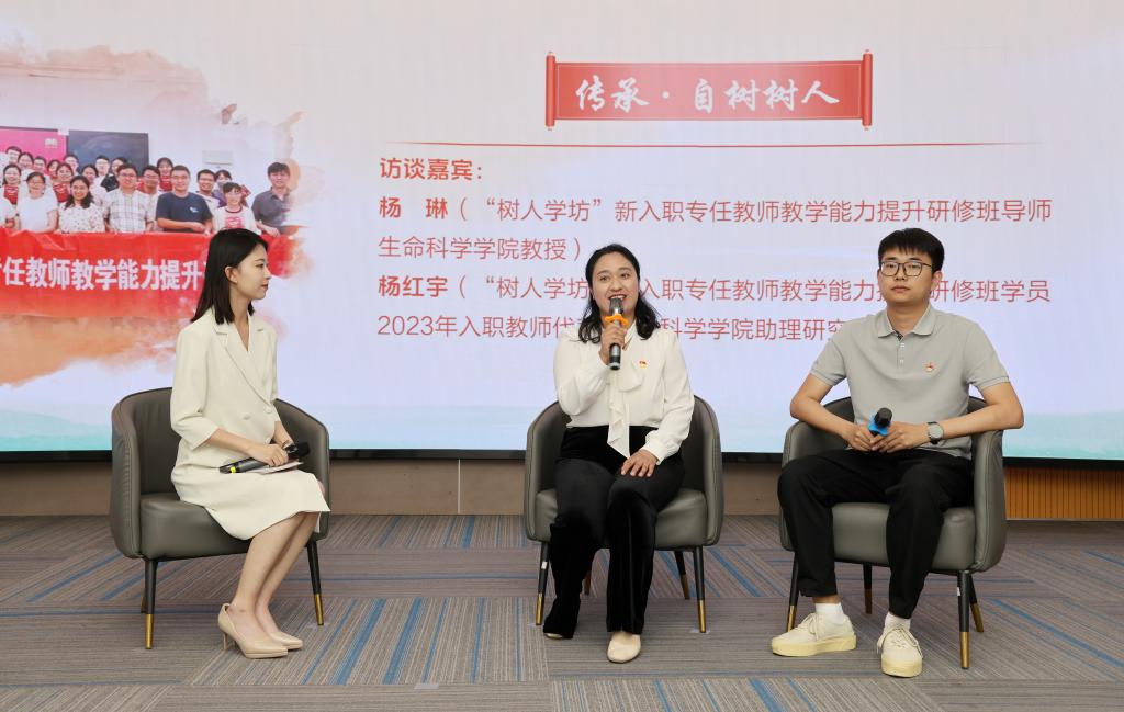 訪談環(huán)節(jié)中,“樹人學(xué)坊”專任教師教學(xué)能力提升研修班教師“師徒”代表,生命科學(xué)學(xué)院教授楊琳和生命科學(xué)學(xué)院青年教師楊紅宇講述自樹樹人、薪火相傳的故事,重溫從教初心、堅(jiān)定教育信仰,矢志以教育家精神為引領(lǐng),用行動(dòng)傳承和踐行教書育人使命。法學(xué)院2020屆校友、新疆維吾爾自治區(qū)和田地區(qū)于田縣先拜巴扎鎮(zhèn)政府四級(jí)主任科員袁雪潔,歷史文化學(xué)院2024屆校友、河北省雄安雄東長興初級(jí)中學(xué)歷史教師、我校第五期赴雄安新區(qū)支教團(tuán)成員王小玲與師生分享了扎根祖國邊疆、投身基層一線,將個(gè)人理想融入時(shí)代洪流的青春故事,以生動(dòng)實(shí)踐在祖國最需要的地方譜寫青春篇章。鮮活的事例、樸素的語言、真摯的情感,引發(fā)現(xiàn)場(chǎng)觀眾強(qiáng)烈的思想共鳴,贏得陣陣掌聲。