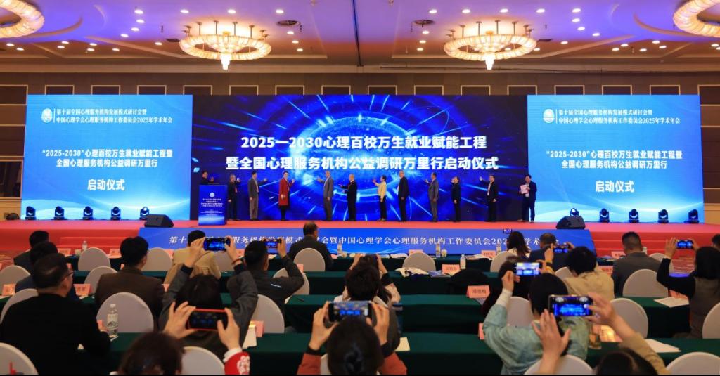 開幕式上,為了響應國家倡導的支持大學生就業(yè)、服務大學生就業(yè)的指導精神,大會舉行了“2025-2030心理百校萬生就業(yè)賦能工程暨全國心理服務機構公益調研萬里行”項目啟動儀式,助推心理專業(yè)人才高水平就業(yè)。