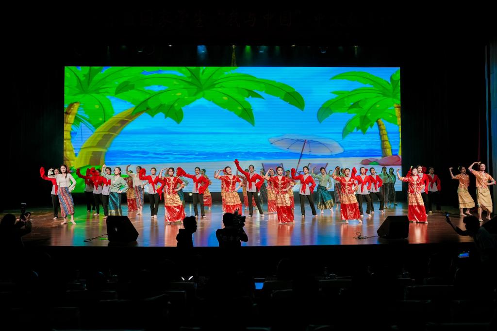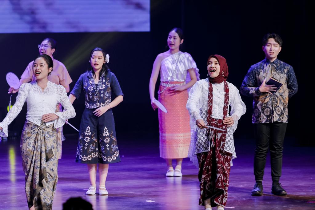 與會嘉賓共同觀看京津冀學(xué)生展演作品,展演在彰顯東盟風(fēng)情的民族舞蹈串燒《多姿》中拉開序幕,原創(chuàng)音樂快板作品《“我與中國”情意長》展現(xiàn)東盟學(xué)子中文水平和精湛才藝的同時,流露出一種深厚的情懷和熱愛;海外組織方以及選手采訪VCR“中文改變了我”中選手們的真情流露感人至深,詮釋了“語言是文化交流鑰匙”的真正含義;北京高校展演作品《你好北外——青春之舞》在講述青春風(fēng)采和中國故事的同時,點燃了青春躍動、共赴新程的理想火焰;舞臺劇《穿越奇遇》完美演繹了古代與現(xiàn)代因文化傳承創(chuàng)新發(fā)展而碰撞出的別樣火花;河北省高校選送節(jié)目《詩經(jīng)東南風(fēng)》中,東盟青年用東南亞歌曲唱誦詩經(jīng),播撒語言互通、理解互信、文明互鑒的種子;在“我與中國”非遺市集游園會中,天津高校東盟學(xué)生選手將文化市集搬到舞臺,為現(xiàn)場觀眾送上新穎獨特的文化創(chuàng)意和實踐體驗;AI創(chuàng)意對話展示《魅力中文》在展示科學(xué)創(chuàng)新發(fā)展的同時,抒發(fā)了希望科技之光引領(lǐng)國際中文教育走向更美好未來的愿望。