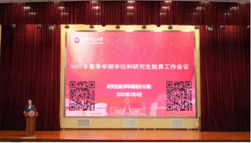 本站訊(通訊員 徐梅芳)為適應時代發展對人才培養的需求,深入貫徹落實學校新學期工作部署會精神,貫徹《中華人民共和國學位法》核心要義,進一步完善學位制度,保障學位質量,推動學科建設與研究生教育事業內涵式發展,學校于3月4日召開 2025 年春季學期學位與研究生教育工作會議。校黨委常委、副校長佟德志,各學部(院)部 (院) 長、分管研究生教育的副部(院)長、研究生秘書、研究生導師代表、研究生代表,教務處相關負責同志以及研究生院全體同志參會。