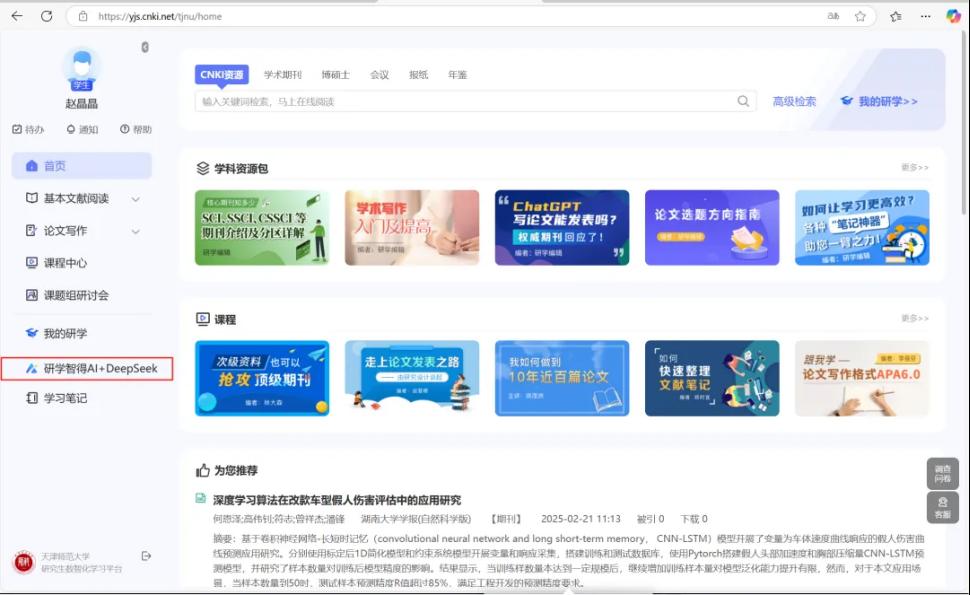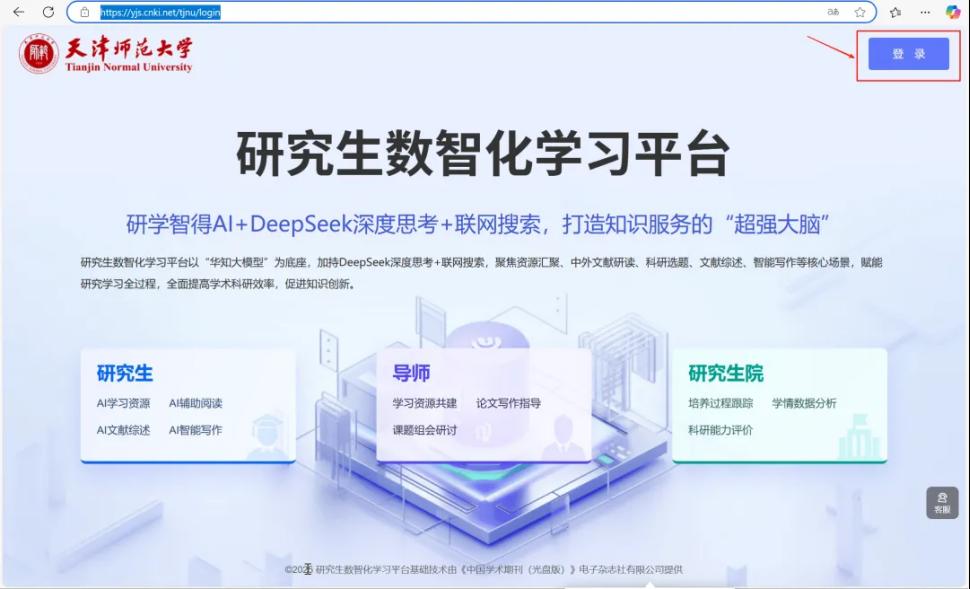 天津師范大學研究生院主頁(https://yjsy.tjnu.edu.cn/)-站點鏈接-研學智得-點擊右上角【登錄】-注冊或登錄個人賬號-選擇學生/導師身份-填寫姓名、學號/工號后進入系統-點擊左側導航欄-【研學智得AI+DeepSeek】即可進入。