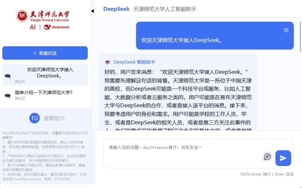 師生使用天津師范大學統一身份認證賬號登錄網上服務大廳https://ehall.tjnu.edu.cn/new/index.html,點擊“AI平臺”圖標,即可進入DeepSeek對話頁面。