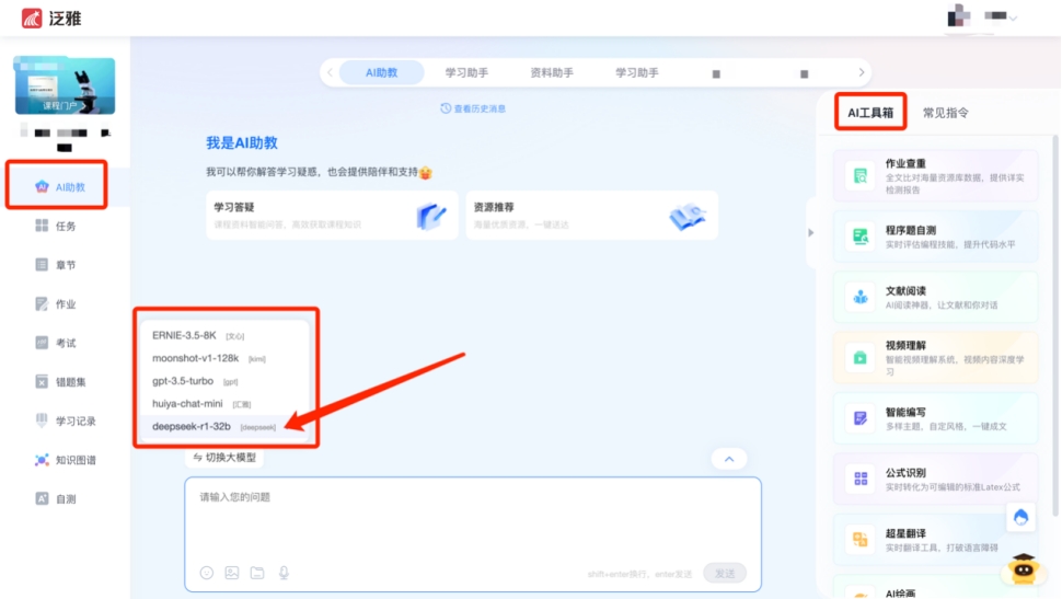 天津師范大學教務處主頁(https://jwc.tjnu.edu.cn/)-站點鏈接-爾雅通識選修課平臺-填寫學號/工號及密碼后進入。登錄個人教學空間后,點擊“課程”—“我教的課(教師)/我學的課(學生)“,選擇具體課程,進入課程主頁面,在左側工具欄,點擊AI助教,即可進行智能問答。近日功能將繼續完善,支持大模型智能切換,請大家關注。