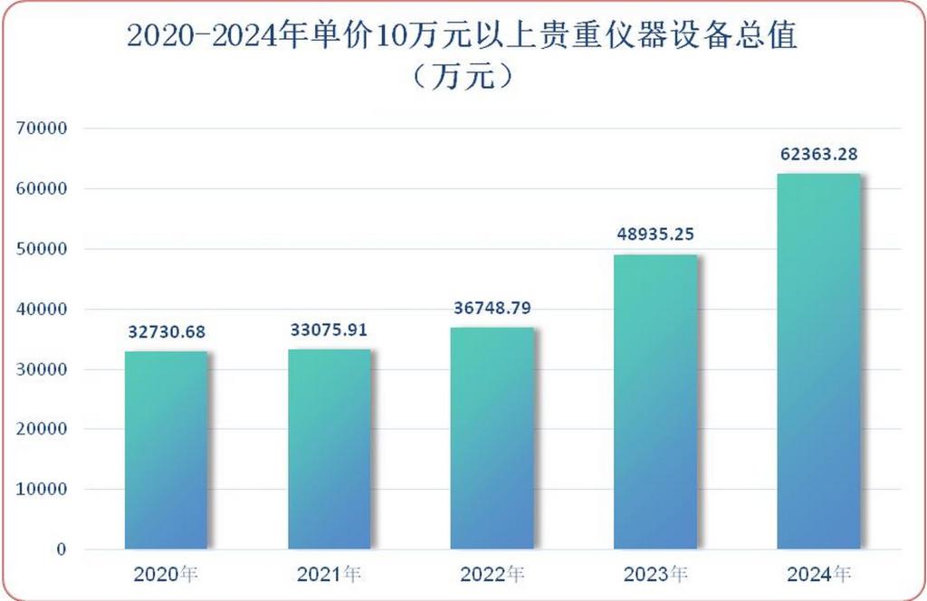 五年間,我校資產總量迅速增加,資產結構更為合理,辦學條件得到顯著改善。2020年,我校儀器設備總值為77793.74萬元,到2024年末已達到123343.09萬元,僅2022年中長期貸款采購教學科研儀器設備家具53861.10萬元,其中,貴重儀器設備248臺件,合同金額21323.85萬元。近五年儀器設備總值增長58.55%。單價10萬元以上貴重儀器設備總值由2020年的32730.68萬元增長至62363.28萬元,近五年總值增長90.53%。