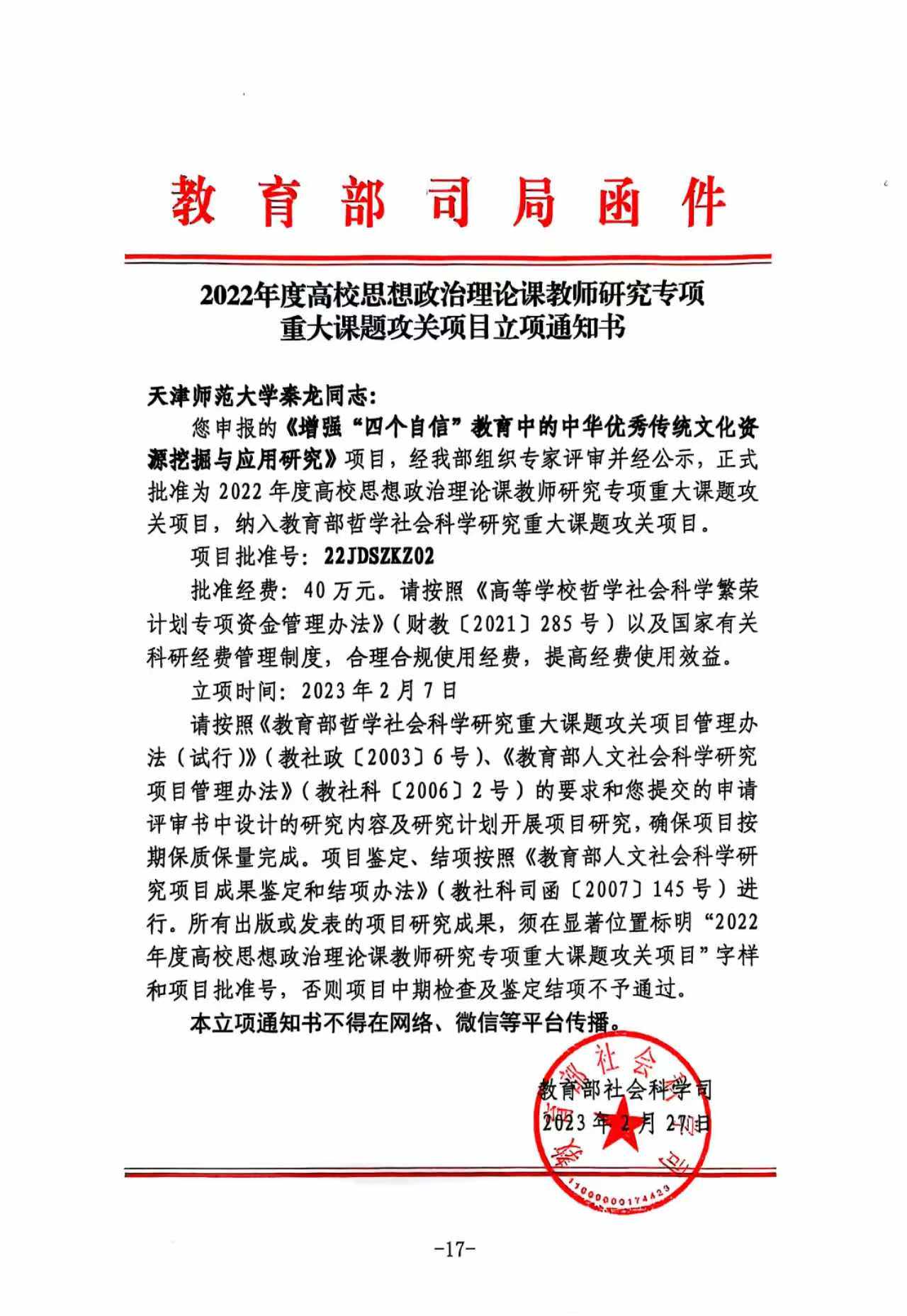 學校堅持馬克思主義在哲學社會科學領域的指導地位,不斷強化有組織科研,持續(xù)開展高水平項目培育,助力推出一批研究闡釋黨的創(chuàng)新理論、服務國家重大戰(zhàn)略、構建中國特色哲學社會科學、傳承創(chuàng)新中華優(yōu)秀傳統(tǒng)文化的科研項目。五年來,學校累計獲批各類人文社會科學項目(含橫向項目)1563項,科研經(jīng)費總計11923.29萬元。其中,獲批國家社會科學基金重大招標項目8項、教育部人文社科重大課題攻關項目2項、國家社會科學基金重點項目12項、其他各類國家社會科學基金項目156項,1項成果入選《國家哲學社會科學成果文庫》;獲批教育部人文社會科學研究基地重大項目4項、教育部人文社會科學研究項目116項(其中重點項目8項);獲批天津市哲學社會科學規(guī)劃項目403項(其中重點項目101項)、天津市教育科學規(guī)劃項目41項(其中重點項目13項)、天津市藝術科學規(guī)劃項目34項。此外,我校還獲批最高人民檢察院、最高人民法院、司法部、國家統(tǒng)計局、國家民族事務委員會、住房和城鄉(xiāng)建設部、國家體育總局、國家語委等項目23項。學校立項橫向課題450項,科研經(jīng)費共5402.83萬元。