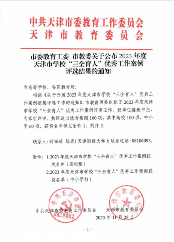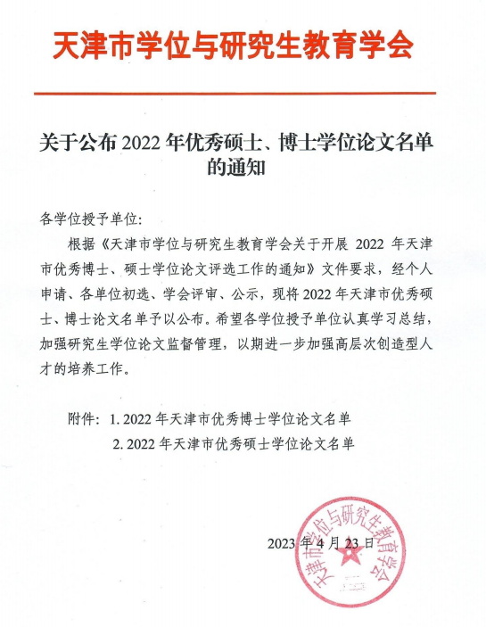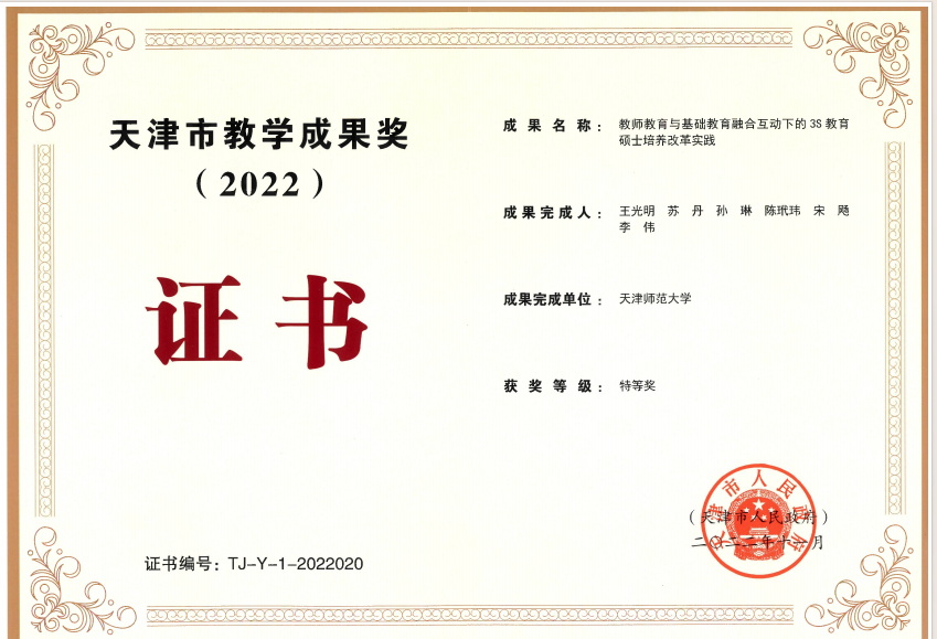 教學(xué)成果獲得高等教育(研究生)國家級(jí)教學(xué)成果獎(jiǎng)二等獎(jiǎng)1項(xiàng),天津市級(jí)教學(xué)成果獎(jiǎng)特等獎(jiǎng)1項(xiàng)、一等獎(jiǎng)4項(xiàng)。獲評(píng)天津市優(yōu)秀青年研究生指導(dǎo)教師4人,天津市優(yōu)秀博士學(xué)位論文指導(dǎo)教師10人,天津市優(yōu)秀碩士學(xué)位論文指導(dǎo)教師30人。