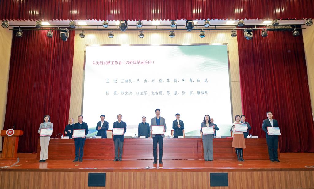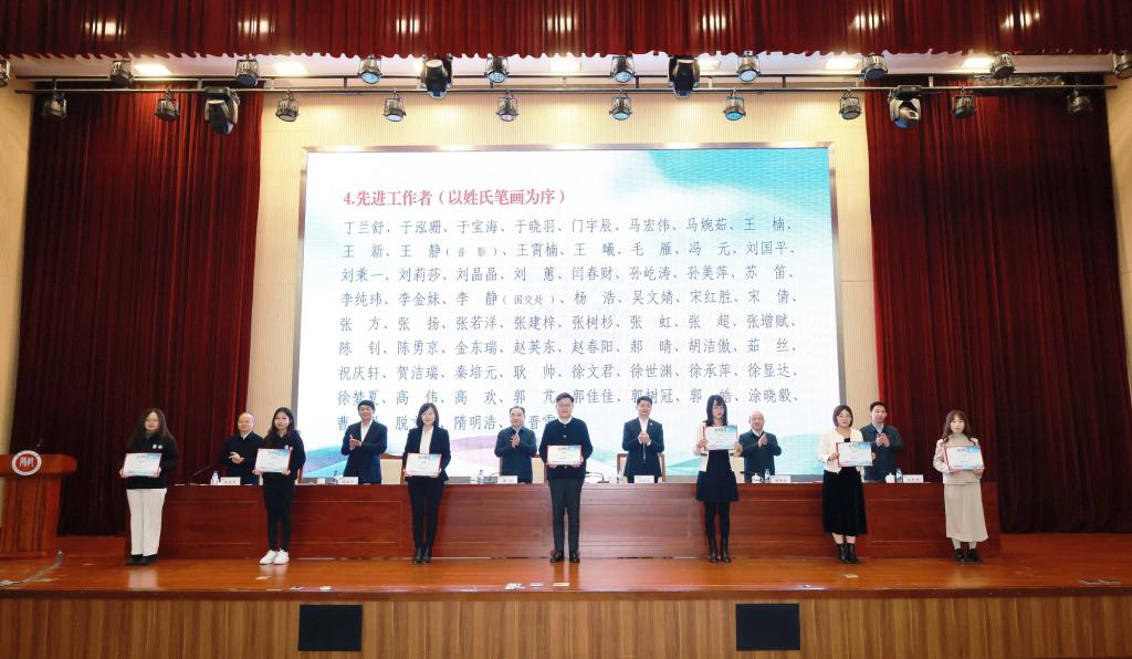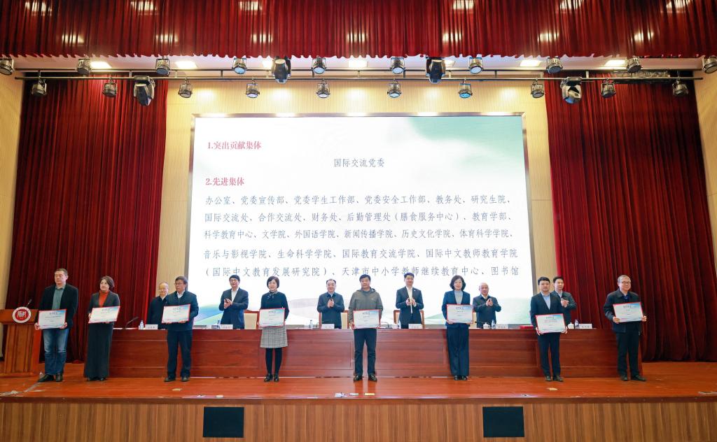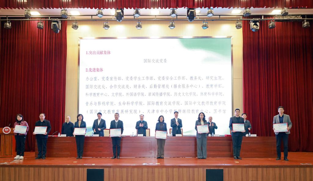 校領導為獲獎集體和個人頒獎。與會人員共同觀看“漢語橋”回顧片。國際教育交流學院、國際交流處、國際中文教師教育學院(國際中文教育發展研究院)、后勤管理處、黨委安全工作部相關負責同志以及志愿者代表作交流發言。我校機關各部、處(室)、直屬單位、各學部(院)師生代表,受表彰人員參加會議。