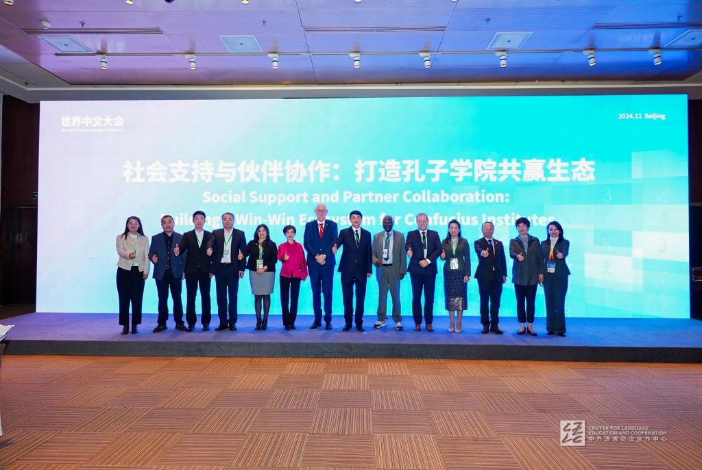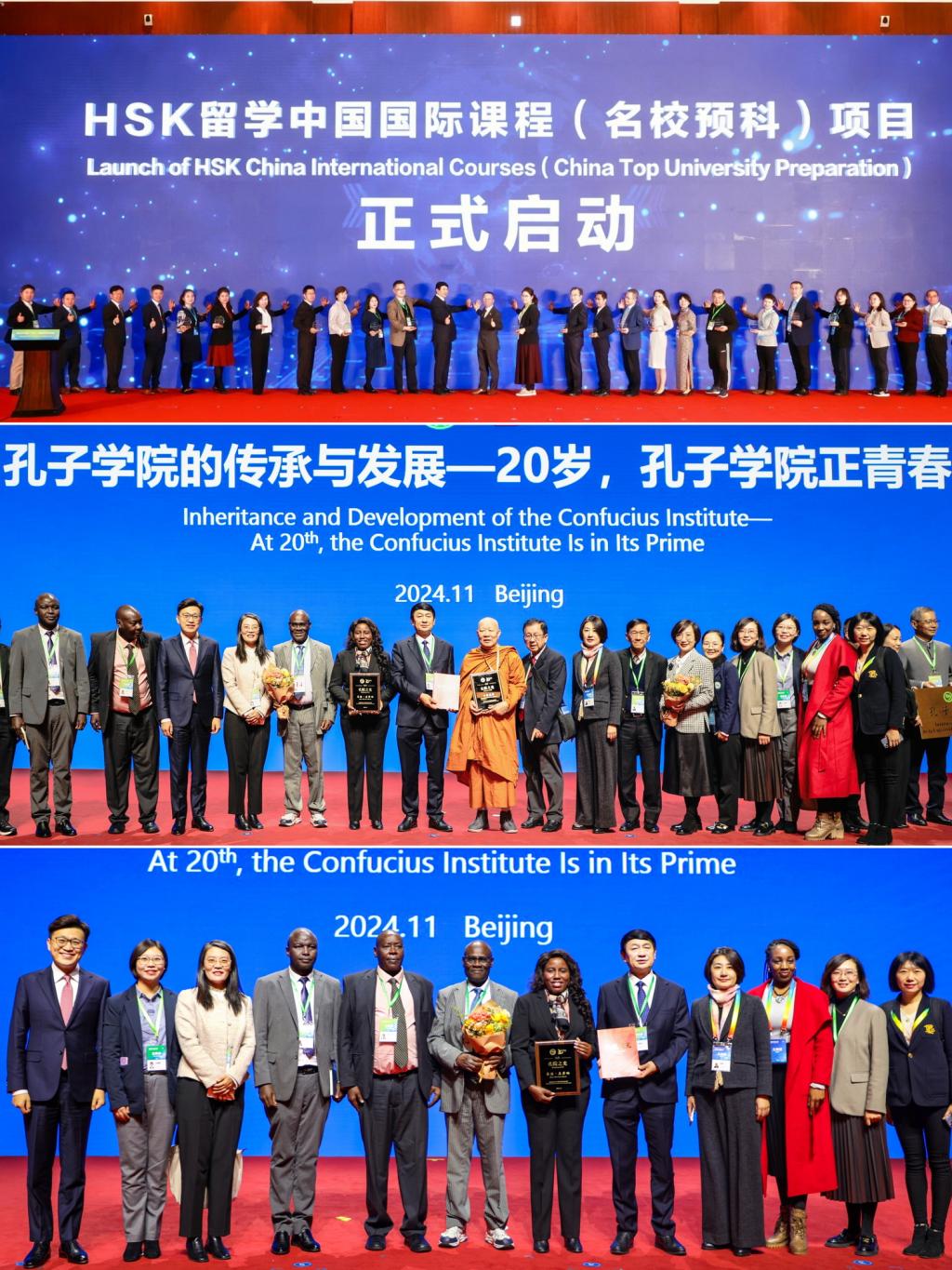 此外,鐘英華還受邀參加紀念孔子學院成立20周年“孔子學院的傳承與發展—20歲,孔子學院正青春”主題研討會,見證了我校內羅畢大學孔子學院合作伙伴—肯尼亞內羅畢大學原校長、孔子學院總部原理事、肯尼亞教育部原部長馬國哈,泰國“海上絲路”孔子學院合作伙伴——“海上絲路”孔子學院理事會主席頌德通猜等獲得孔院20年“孔院之光”稱號;出席世界中文大會中文水平考試(HSK)全球合作伙伴大會,為獲獎單位頒獎,與漢考國際董事長李佩澤等共同啟動HSK留學中國國際課程(名校預科)項目。