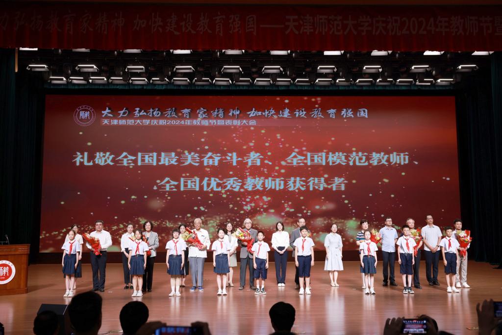 表彰大會(huì)上,“全國(guó)最美奮斗者”、全國(guó)模范教師、全國(guó)優(yōu)秀教師等在學(xué)校發(fā)展建設(shè)中取得國(guó)家級(jí)榮譽(yù)的老中青先進(jìn)典型代表受邀上臺(tái)。青年教師代表和天津師范大學(xué)附屬實(shí)驗(yàn)學(xué)校的學(xué)生們?yōu)樗麄儷I(xiàn)上鮮花。現(xiàn)場(chǎng)全體人員起立鼓掌,向他們致敬,并送上深深的祝福。在天津師范大學(xué)優(yōu)秀教師楊琳的領(lǐng)誓下,全體教師面向校旗莊嚴(yán)宣誓,重溫教師誓詞,堅(jiān)定從教初心,對(duì)承擔(dān)“為黨育人、為國(guó)育才”神圣使命作出莊嚴(yán)承諾,牢固樹(shù)立“躬耕教壇,強(qiáng)國(guó)有我”的志向與抱負(fù)。