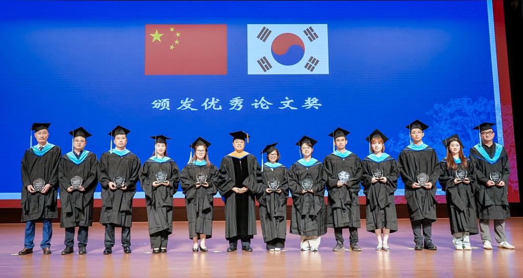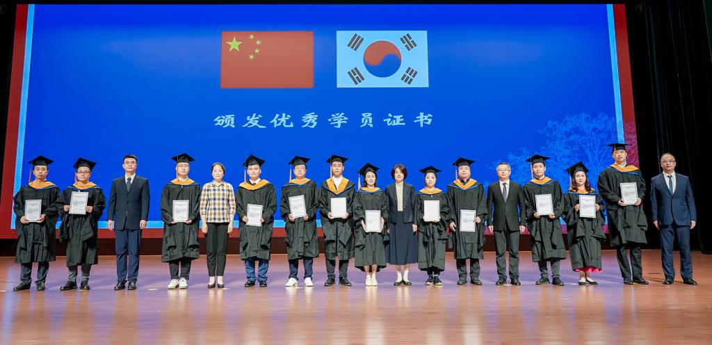 楊薇作本屆中韓合作辦學項目碩士研究生培養過程報告。中韓雙方相關部門負責人向雙方教學和管理人員、優秀學員等頒發優秀論文證書和優秀學員證書。
