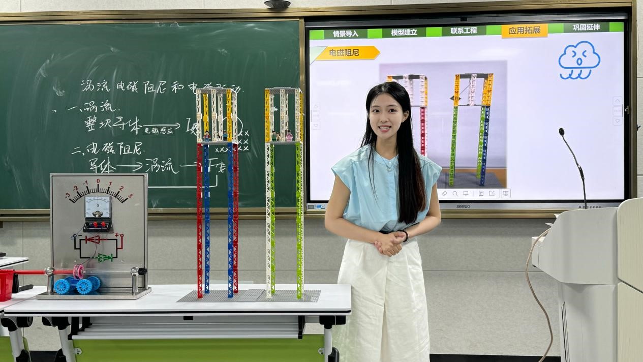 活動中,施芷妍結合可視光路加光傳感器,形象展示了光的偏振現象;林慧玲以最新的方式呈現最舊的實驗,打造極富趣味的電磁“明星”實驗;高可瑩以項目式教學的理念展示了反沖的物理實質;陳雨馨制作FAST天眼模擬演示儀講述光的反射原理;劉蕊利用信息化與教學相融合展示了液體壓強的特點及應用。