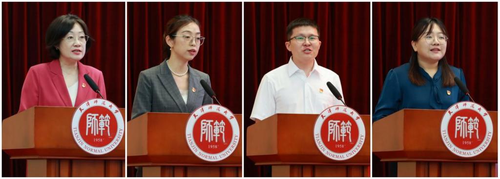 與會校領導為新發展黨員代表佩戴黨員徽章。大會表彰了天津市高校首屆專職組織員素質能力“大比武”和學校主題實踐活動、微型黨課比賽中獲獎的集體和個人,并為“光榮在黨50年”老黨員代表頒發紀念章。榮獲2023年度主題實踐活動優秀組織獎的生命科學學院黨委書記石婕、榮獲2023年度主題實踐活動一等獎的教師黨支部代表馬克思主義學院中國近現代史綱要教研室黨支部李紅娟、學生黨支部代表美術與設計學院環境設計專業本科生黨支部書記成豪、榮獲天津市高校首屆專職組織員素質能力“大比武”一等獎的文學院專職組織員戴蕾等四位同志作為受表彰代表現場發言,從不同角度全面展示了我校基層黨建工作的風貌,展現了我校共產黨員敢于擔當、無私奉獻的精神,彰顯了各級基層黨組織凝聚師生、團結群眾的強大力量。大會開始前,播放了反映一年來我校黨建工作的專題片《強黨性攻堅提質,謀發展善作善成》。