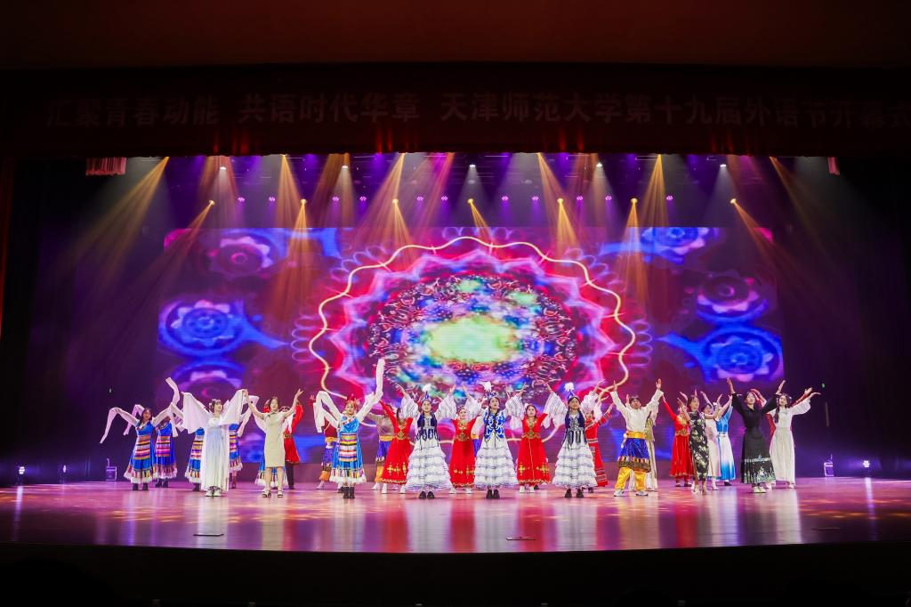 本屆外語(yǔ)節(jié)開(kāi)幕式現(xiàn)場(chǎng)節(jié)目涵蓋中國(guó)傳統(tǒng)文化、民族團(tuán)結(jié)、“一帶一路”沿線(xiàn)國(guó)家民族風(fēng)情等主題;用朗誦、舞蹈、話(huà)劇、多語(yǔ)種演唱等形式,為全校學(xué)生搭建起跨文化交流互鑒的平臺(tái)。朗誦、合唱《如愿》,回望百年風(fēng)云,感懷先輩的奮斗與犧牲,感悟山河無(wú)恙,國(guó)泰民安;民族歌舞《民族一家親》緊緊圍繞鑄牢中華民族共同體意識(shí)主線(xiàn),展現(xiàn)不同民族獨(dú)特的魅力;舞臺(tái)劇《光亮》將傳統(tǒng)文化與現(xiàn)代文化相結(jié)合,飽含深意、耐人尋味;舞蹈《青春之歌》展現(xiàn)革命先輩點(diǎn)燃救亡圖存的希望火種,奏響憤慨激昂的青春之歌;合唱《一起向未來(lái)》用五國(guó)語(yǔ)言的歌聲交織,承載著希冀與憧憬,將開(kāi)幕式氣氛推向高潮。