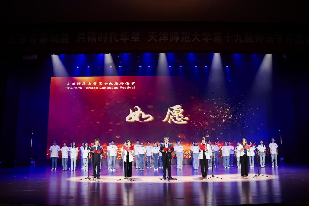 外國(guó)語(yǔ)學(xué)院消息(通訊員 陳乾坤)4月25日,以“匯聚青春動(dòng)能共語(yǔ)時(shí)代華章”為主題的天津師范大學(xué)第十九屆外語(yǔ)節(jié)在國(guó)際學(xué)術(shù)交流中心開(kāi)幕。校黨委副書(shū)記陳泮成出席開(kāi)幕式并致辭,學(xué)校辦公室,校黨委組織部、宣傳部、統(tǒng)戰(zhàn)部、學(xué)工部,校團(tuán)委、教務(wù)處、研究生院等有關(guān)部門(mén)主要負(fù)責(zé)人參加活動(dòng),新航道國(guó)際教育集團(tuán)總裁助理、新航道天津?qū)W校校長(zhǎng)雷豐奎受邀出席。外國(guó)語(yǔ)學(xué)院領(lǐng)導(dǎo)班子、各語(yǔ)系專(zhuān)業(yè)教師及全校學(xué)生代表700余人參與此次活動(dòng)。