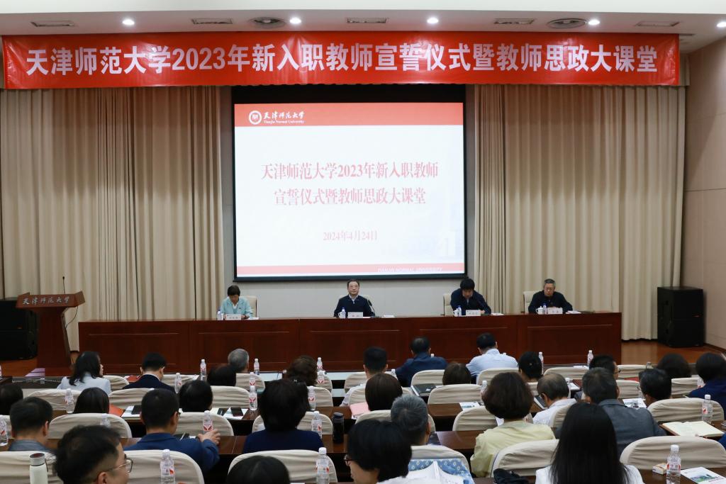 會上,校領導為2023年新入職教師代表佩戴校徽、發放《教師師德手冊》和《身邊的楷模——天津師范大學優秀教師先進事跡選編》。新入職教師代表向校領導遞交師德承諾書。在天津師范大學優秀教師、歷史文化學院副教授陳晨的領誓下,全體新入職教師面向校旗鄭重宣誓,許下莊嚴承諾,立志為黨育人、為國育才。天津市高等學校教學名師、外國語學院院長冀小婷教授代表在職教師發言,地理學部陳小強代表新入職教師發言。