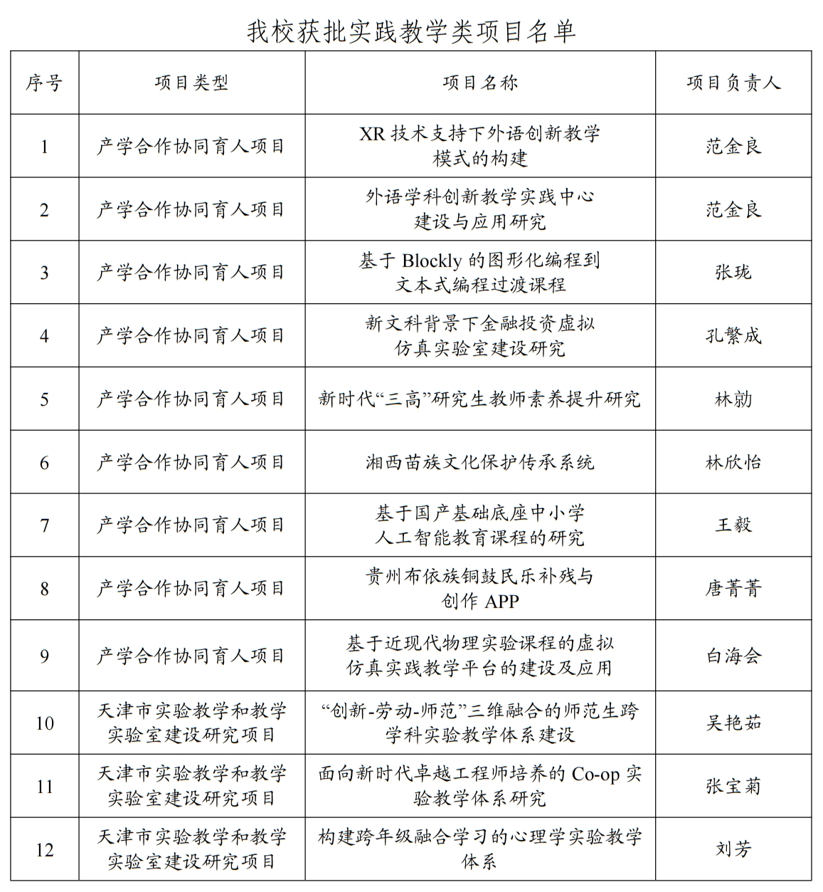 教務(wù)處消息(通訊員 李倩)近日,教育部公布“2024年第一批產(chǎn)學(xué)合作協(xié)同育人項(xiàng)目立項(xiàng)名單”,我校9個項(xiàng)目在列;天津市教委公布“2024年天津市實(shí)驗(yàn)教學(xué)和教學(xué)實(shí)驗(yàn)室建設(shè)研究項(xiàng)目立項(xiàng)名單”,我校3個項(xiàng)目獲批。