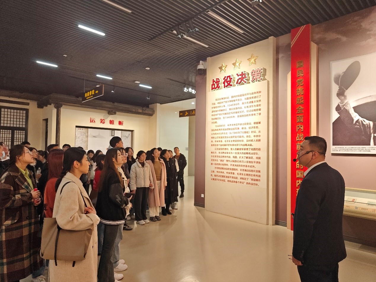 主展館陳列展由序廳、戰役決策、戰役實施、人民支前、英烈業績、偉大勝利六個部分組成,一幅幅歷史珍貴圖片,一件件斑駁的老物件,一幕幕戰斗情景再現,全面、真實地還原了平津戰役的各種歷史細節,展現了中國共產黨領導人民解放軍取得平津戰役偉大勝利的壯闊史詩。在講解員的指引下,全體同學仔細觀看展覽,不時在展柜邊駐足觀看,深刻感受到了中國共產黨人和先輩們追求理想的堅定信念和不怕犧牲、奮勇向前的革命精神。
