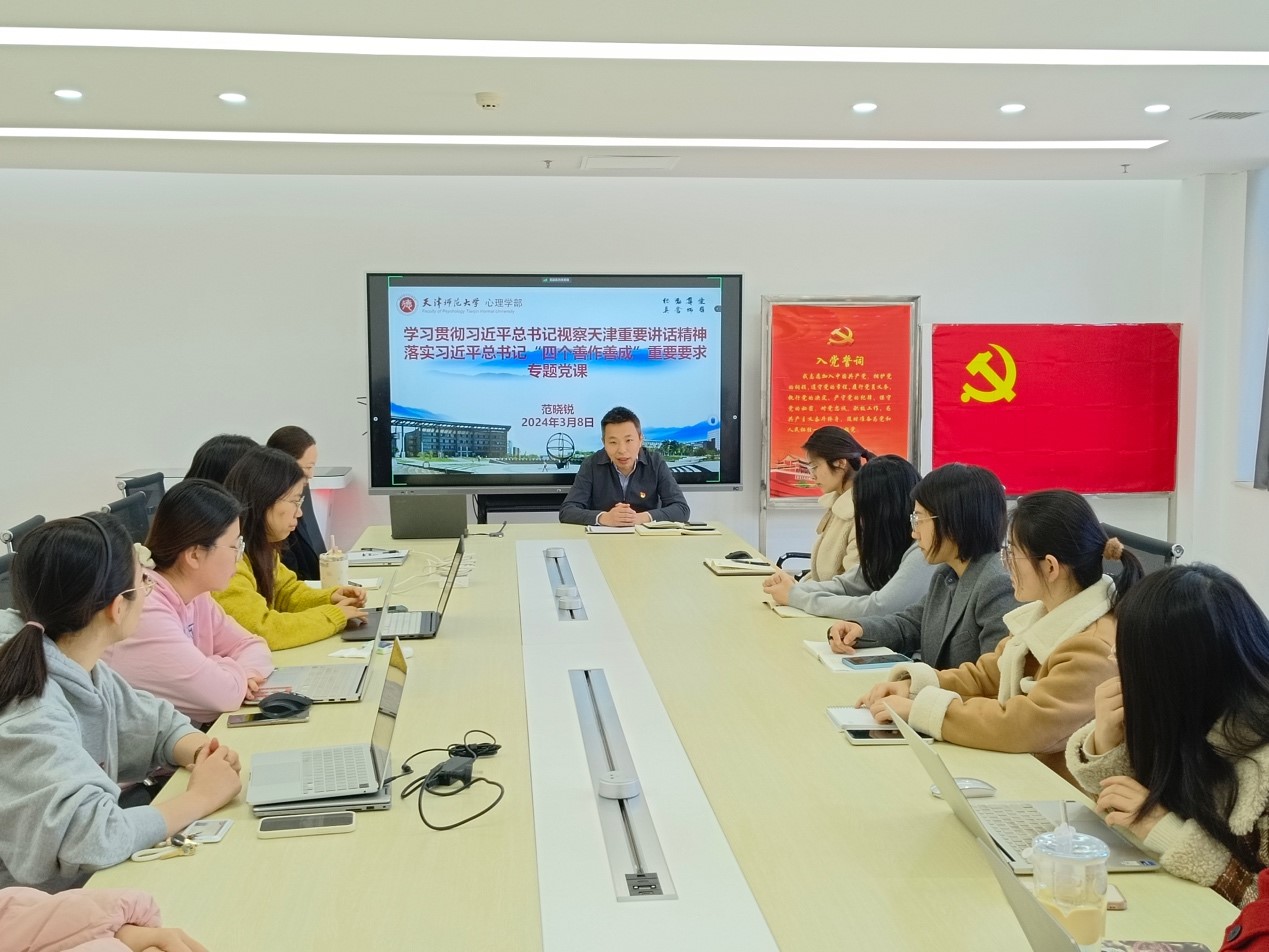 專題黨課上,博士研究生黨支部書記范曉銳以“四個善作善成”為主線,帶領與會學生黨員對習近平總書記視察天津期間重要講話精神進行了全面、深入、系統地解讀。他勉勵全體博士生黨員,作為心理學專業學子,要讓個人科學研究服務于國家各項事業的發展,要利用好自己的專業所學踐行習近平總書記的重要講話精神,根據當今時代需求,為人民群眾提供精準的心理健康服務,推動社會和諧穩定,貢獻心理學部力量。