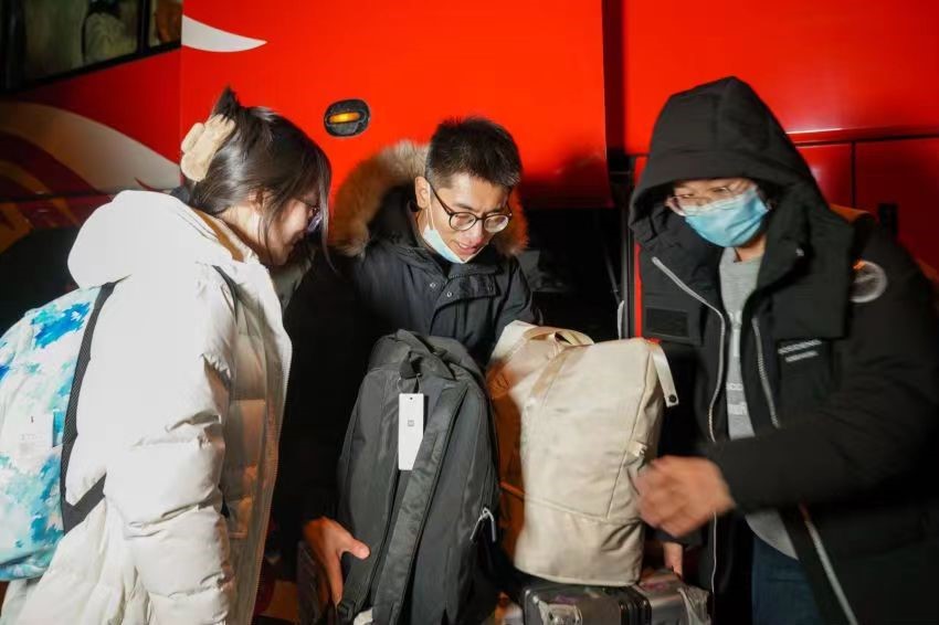 隨后,支教團師生乘坐大巴車返回學校,雖已臨近凌晨五點,各學部、學院輔導員等師生代表仍翹首以盼在校內迎接同學們的歸來,他們一起幫助學生搬運行李,提供暖心服務。