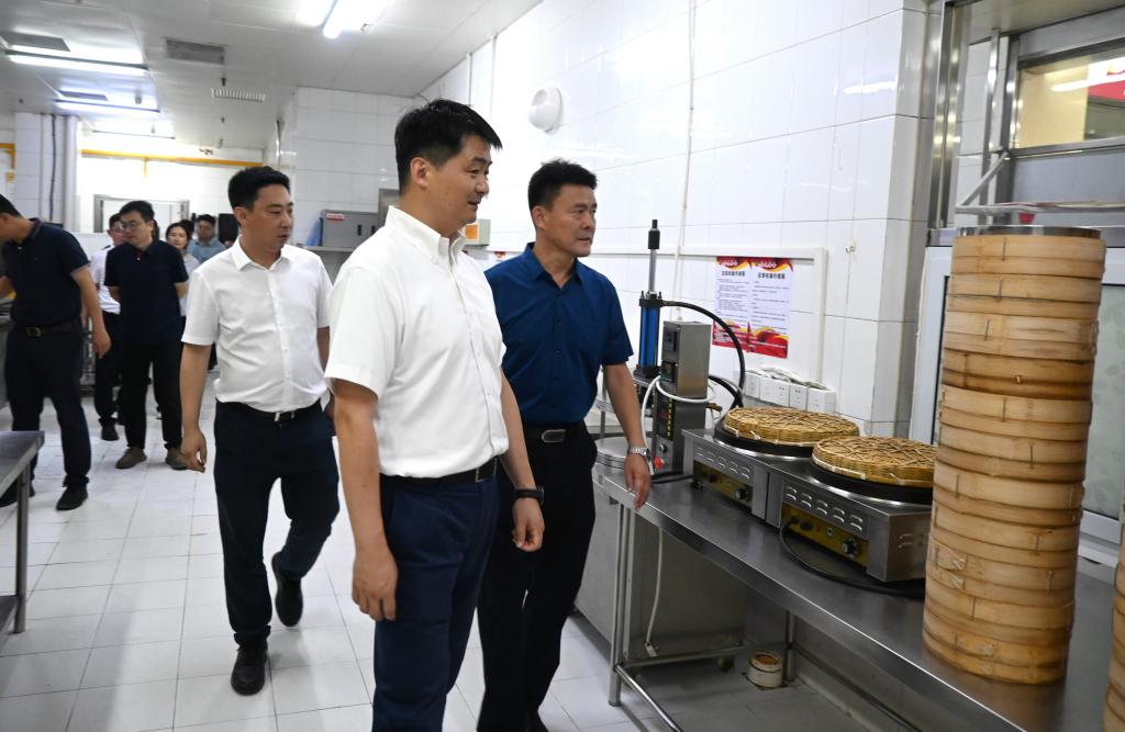 在學(xué)生第二食堂,鞏金龍深入烹飪操作區(qū)和洗消保潔區(qū),了解糧食儲備和菜品種類、環(huán)境衛(wèi)生和餐具消殺、消防保障和用電安全等方面工作,要求要進一步提高校園食品安全意識,壓實安全管理責(zé)任,保障師生“舌尖上”的安全。