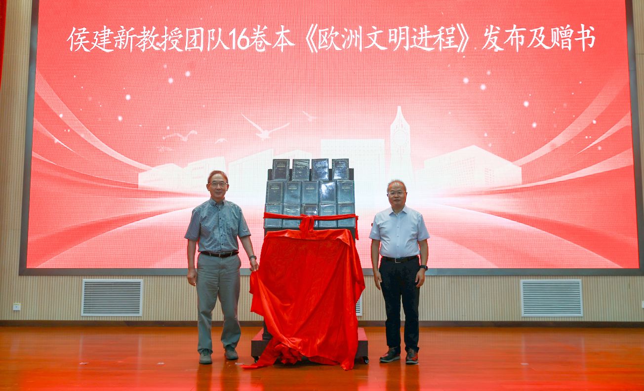 白學軍與侯建新共同為《歐洲文明進程》(16卷本)新書揭幕,侯建新教授代表研究團隊向學校贈書。
