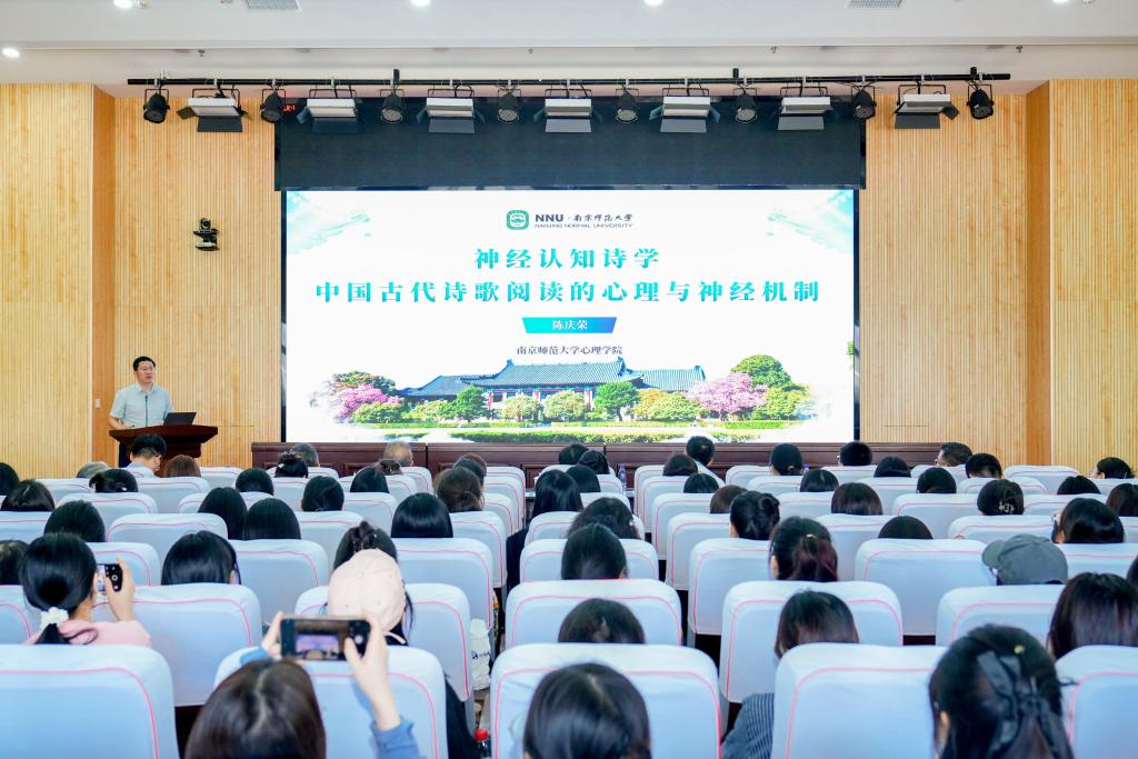 南京師范大學教務處處長陳慶榮教授作題為“神經認知詩學——中國古代詩歌閱讀的心理與神經機制”的報告。他分享了關于中國心理學自主知識體系建設的思考,提出了“回歸構建背景”“回歸基本概念”“回歸理論特質”三個回歸原則,介紹了其帶領的團隊通過大語言模型與神經科學技術,揭示中國人欣賞古代詩歌時的獨特大腦機制,為傳統文化與心理學的融合與應用開辟新路徑。