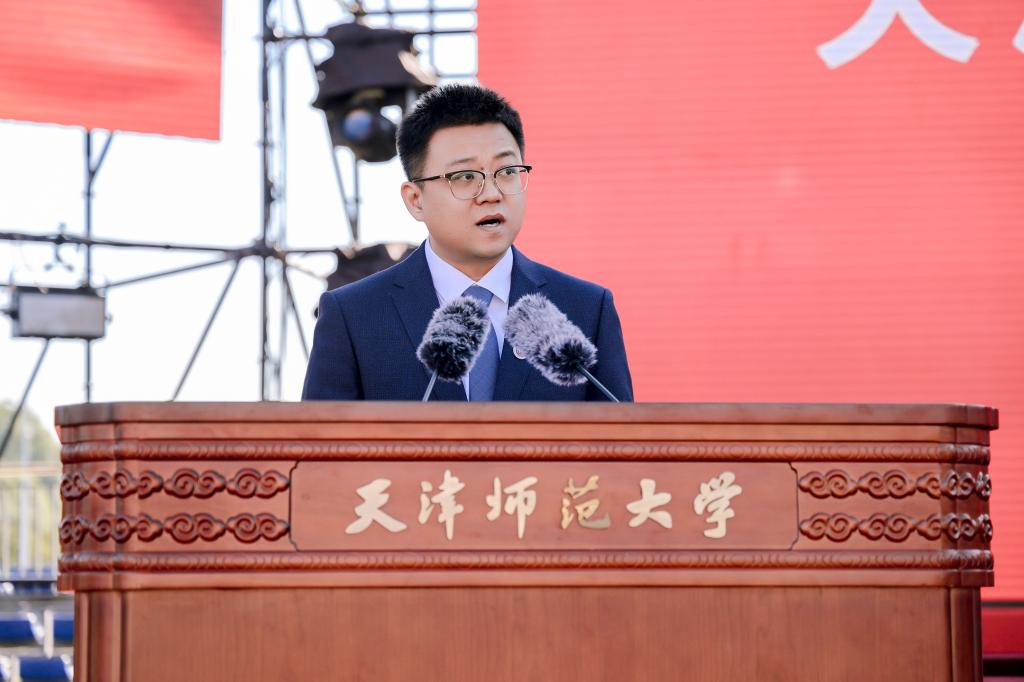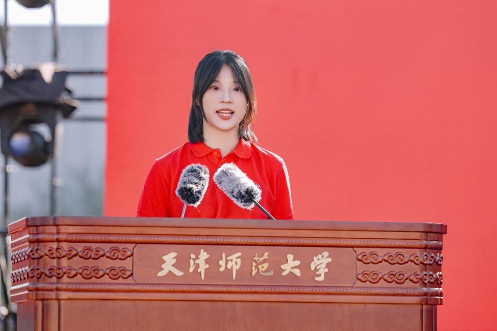 “立鴻鵠志,做奮斗者,賡續師范榮光!”的青春宣言響徹全場。在《筑夢天師 津彩啟航》的歡迎辭中,博士研究生國家獎學金獲得者、心理學部2023級博士生高源霞,第二屆全國大學生職業規劃大賽銅獎獲得者、政治與行政學院2023級碩士生扈馨予,上合組織天津峰會、“漢語橋”賽事學生志愿者、外國語學院2022級本科生李增豪,國際教育交流學院2022級本科生凱文(赤道幾內亞籍),以及我校赴邊疆支教、扎根西部從教的2025屆優秀畢業生代表、大學生支教團代表,以“青春奮斗正當時”激情號召全體師大學子大力弘揚教育家精神,傳承師大情懷,涵育師范品格,踐行人生理想,回應時代召喚,勤學篤行、奮發有為、挺膺擔當。