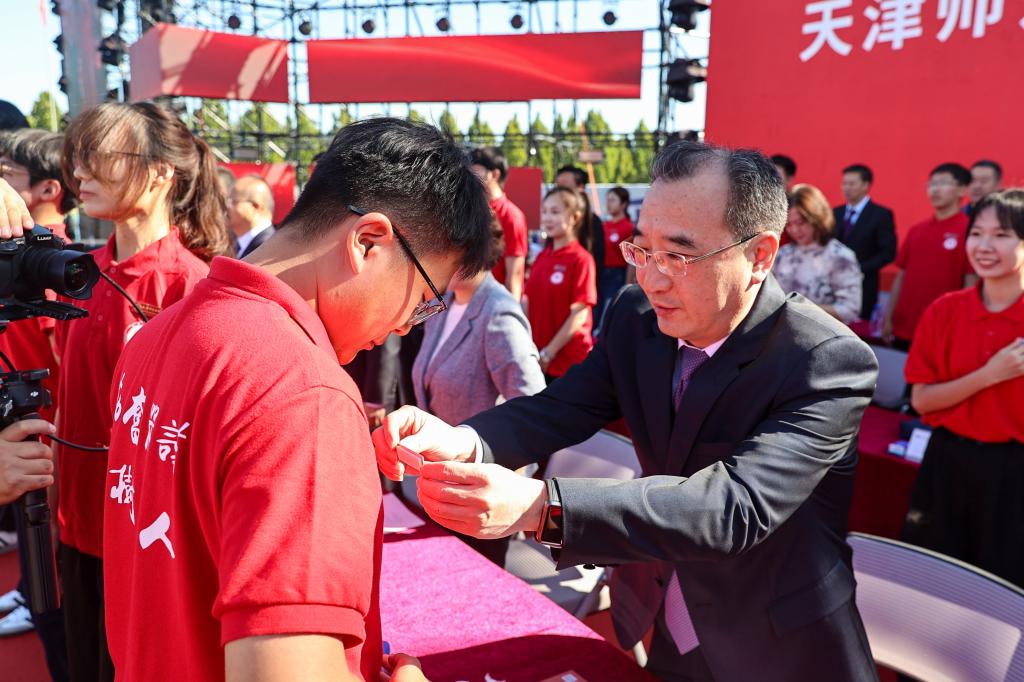 主席臺領導嘉賓為新生代表佩戴?;眨珗鐾瑢W鄭重佩戴承載天津師大人使命的母校?;铡L鞄煷髮W子必將牢記囑托,厚植家國情懷,堅定不移聽黨話、跟黨走,共同奮力書寫為中國式現代化挺膺擔當的青春篇章!