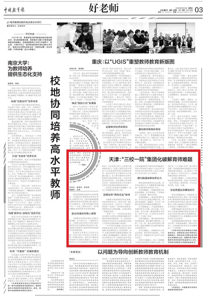 近日,我校深化教師教育改革,探索新時代高水平教師培養新路徑和新模式的創新做法和突出成效受到廣泛關注。9月25日,《中國教育報》“教師教育創新機制改革試點專欄”以《天津:“三校一院”集團化破解育師難題》為題,報道了我校打造“UGIS”(U為高校、G為地方政府、I為教師研修機構、S為中小學校)教師教育協同培養體系的相關工作經驗,對我校強化校地之間協同培養機制的創新實踐給予了高度關注和肯定。