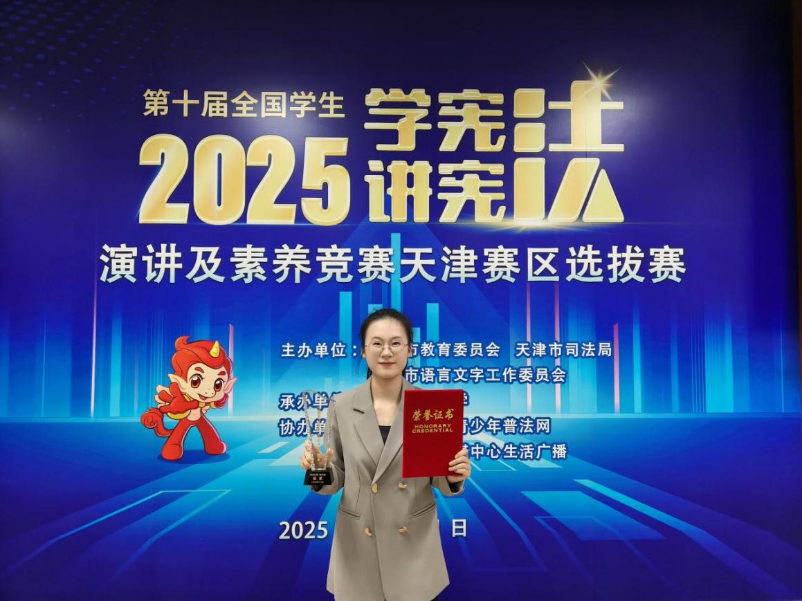 本站訊(通訊員 于淼)10月11日,由天津市教育委員會、天津市司法局、天津市語言文字工作委員會聯合主辦的第十屆全國學生學憲法、講憲法演講及素養競賽天津賽區選拔賽圓滿收官。我校政治與行政學院2023級本科生朱丹煜從全市各高校優秀選手中脫穎而出,榮獲高校組冠軍。