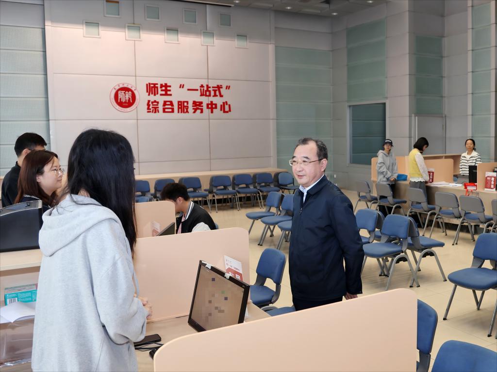 在師生“一站式”綜合服務中心,曲凱與正在辦理業務師生、現場工作人員親切交流,詳細詢問服務項目辦理流程、師生使用體驗及中心管理運營中亟需改進的方面與需求。他強調,建設師生“一站式”綜合服務中心是學校落實“以師生為中心”服務理念、推動管理服務下沉、打造智慧校園的重要舉措。要牢固樹立“大服務觀”,持續完善功能設置、不斷豐富服務內涵,加強各部門間協同聯動、確保服務響應及時高效,及時收集師生反饋、持續改進服務質量,營造富有歸屬感和凝聚力的育人新陣地。