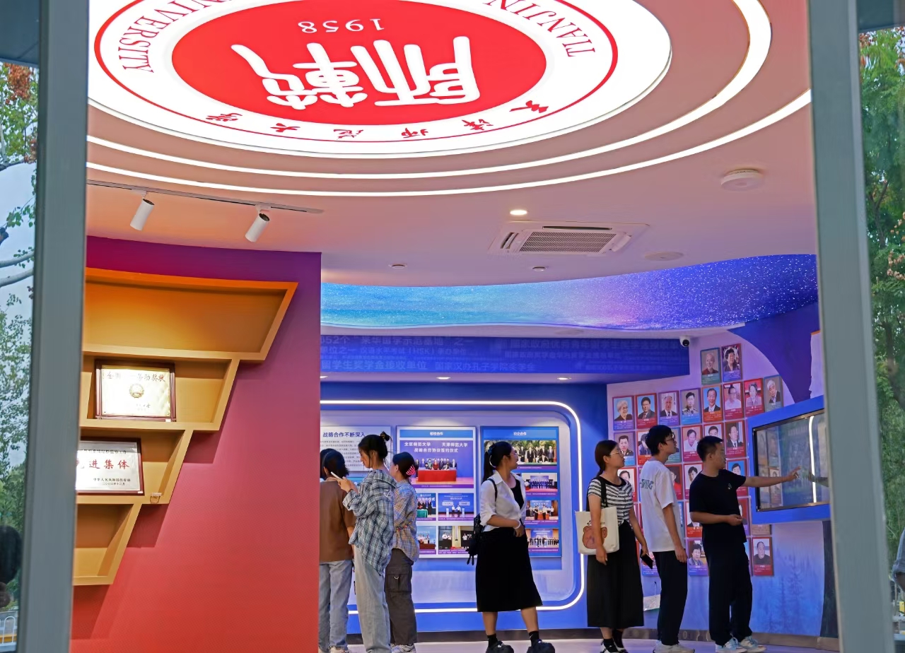 改造后的天津師范大學校史館,汲取天津百年師范教育傳承的典型元素,整體風格樸素典雅。各級領導對我校關懷和指導的難忘瞬間、悠揚的校歌、鏗鏘的校訓、觀瀾溯源的校史發展路線圖、師大八里臺禮堂和90年代老教室的逼真再造、酷炫的創新互動……穿越時間空間,帶領參觀者感受師大人愛國奉獻、追求卓越的壯闊情懷,觸摸師大人執筆書寫“教育強國,師大何為”時代答卷的不懈追求。六秩天津師大的光輝校史,激勵每一位師大人在新的歷史征程上奮勇前行,以更加飽滿的熱情和更加堅定的信念,為中國式現代化貢獻更多的智慧和力量。