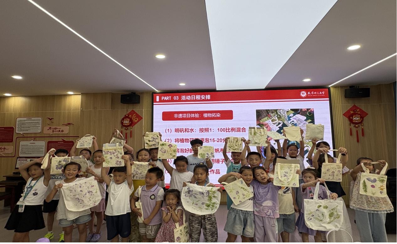 實踐團開展了“拓花草之印,染自然之美”的植物拓染活動。志愿者們講解了拓染的原理,孩子們小心翼翼地將花葉擺成自己喜歡的圖案,然后用錘子一下下輕敲。隨著錘起錘落,原本潔白的帆布包上漸漸浮現出花葉的輪廓。通過“看-聽-做”這種沉浸式體驗,孩子們的專注能力得到提升,同時收獲感滿滿。