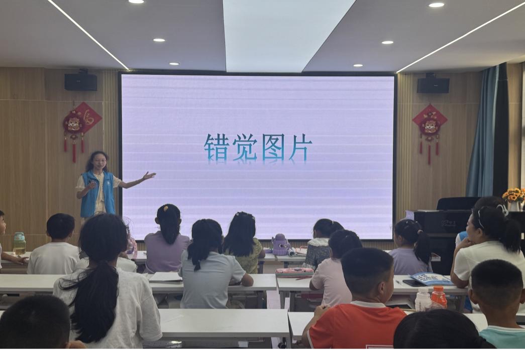 一幅幅錯覺圖片迅速點燃了孩子們的好奇心,孩子們通過菲克錯覺圖片、動態錯覺實驗了解到眼睛和大腦如何被背景信息所迷惑。實踐團成員解釋道“當背景信息與大腦的預判發生沖突時,錯覺就產生了”。通過心理科普課,孩子們學到了眼睛和大腦如何共同工作,開始思考“眼見未必為實”背后的科學邏輯,產生了對科學的好奇心。