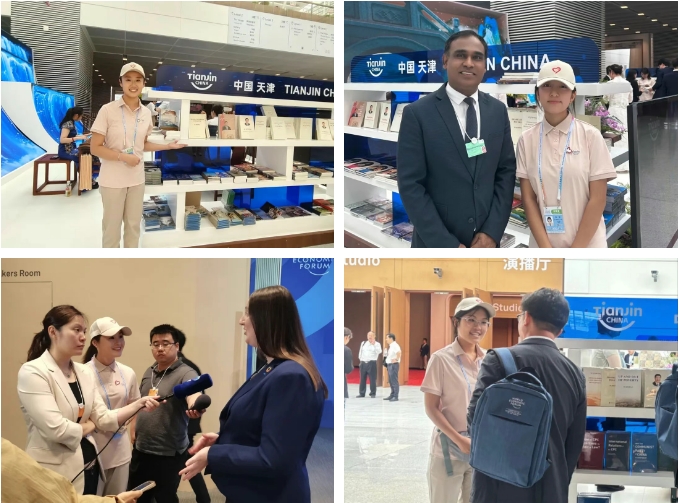 在論壇文化展區(qū),師大志愿者們化身“文化使者”,為中外嘉賓精選人文社科、經(jīng)濟(jì)科技等領(lǐng)域的經(jīng)典著作。外事采訪口譯崗位上,師大志愿者們憑借扎實(shí)的雙語功底和跨文化溝通能力,協(xié)助中外媒體完成多場訪談。在攝影記者和采訪媒體身旁,師大志愿者們提前熟悉拍攝流程和場地布局,快速協(xié)調(diào)機(jī)位、疏導(dǎo)人群,為記者創(chuàng)造最佳拍攝條件。他們的專業(yè)素養(yǎng)和應(yīng)變能力,確保了一個個精彩瞬間被完美定格。在南開大學(xué)停車場接駁點(diǎn)和會場之間,天津師范大學(xué)志愿者們輪班值守,頂著烈日引導(dǎo)車輛、協(xié)助嘉賓乘車,高效完成嘉賓接送、車輛調(diào)度、應(yīng)急保障等工作。師大志愿者們以真摯的微笑傳遞城市溫度,用專業(yè)的服務(wù)詮釋青春擔(dān)當(dāng),在每一個平凡崗位綻放非凡光彩,向世界繪就新時代天津青年的精神畫卷。
