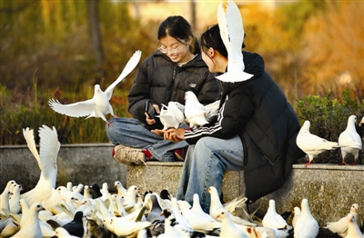 近年來,天津師范大學加大美麗生態校園建設力度,校園生態環境質量得到快速提升。圖為近日在天津師范大學校園里,學生與鴿子和諧互動。