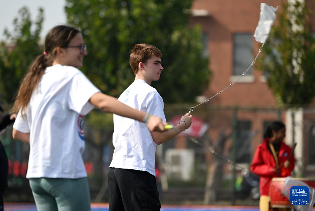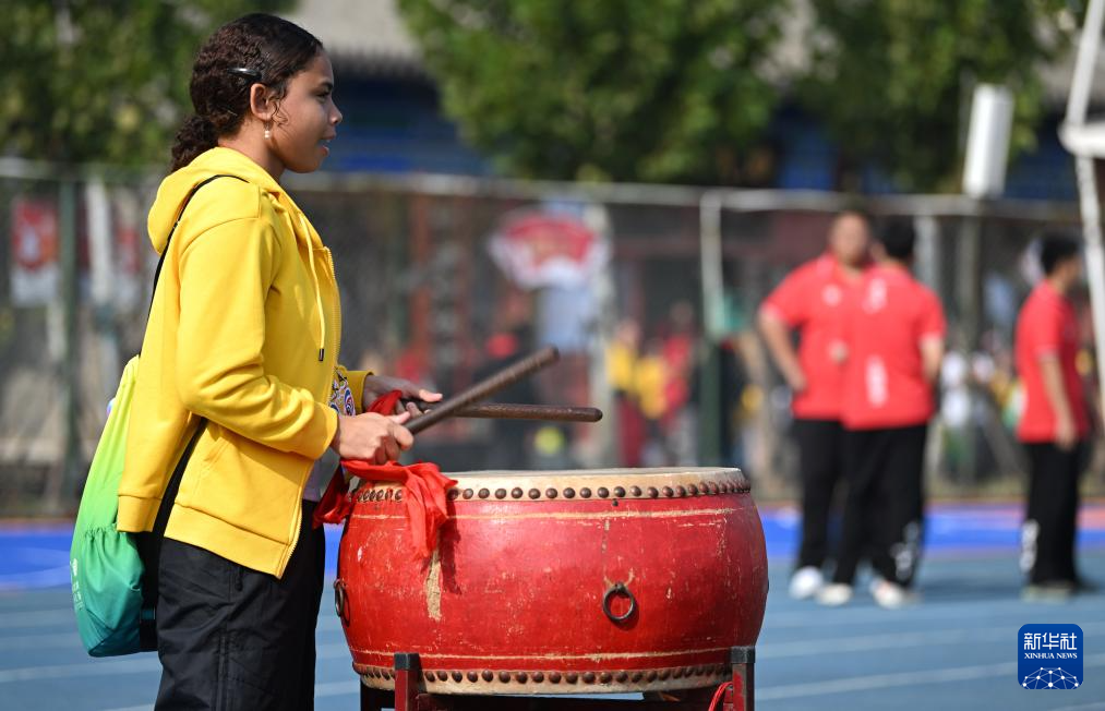 10月25日,“漢語橋”選手在天津霍元甲學校的操場上打鼓。