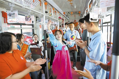 公交職工還為大家帶來二胡演奏、小合唱等精彩節目,車廂內還特意準備了津味傳統月餅供學生們品嘗,現場氣氛越來越熱烈。來自加納的留學生高娜娜說:“這是我第一次吃月餅,很好吃。中秋節很有意義,圓圓的月餅寓意團團圓圓,我非常喜歡天津這座城市。”天津師范大學外國語學院黨委副書記蘇笛告訴記者,這次共建活動中,該校學生發揮文化傳承和國際交流方面的專業優勢,與公交攜手展現美麗天津形象,提升了天津的國際影響力。